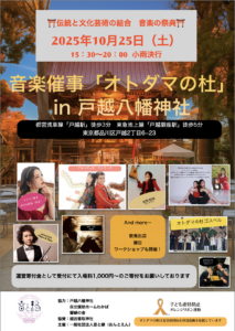 26 9月 2025 戸越八幡神社 お知らせ 2025年9月26日 戸越八幡神社 オトダマの杜 10月25日(土) この度、2025年10月25日土曜日15時半より、音楽催事「オトダマの杜」を開催いたします。 戸越八幡神社の清々しい秋の夕暮れの境内にて、様々なジャンルのアーティストが集い、心躍るステージが繰り広げられます。この演奏会が、皆様の心の開放に繋がればと心から願っております。 ご来場、お待ち申し上げます。 一般社団法人 音と縁(おんとえん)