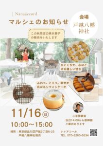 ふわっと、とろける幸せのひとくち。 優しい甘さで心ほどける、Nanaaccord(ナナアコール)のシフォンケーキをはじめ、 秋限定の焼き菓子を販売いたします。 当日は、戸越八幡神社の穏やかな空気に包まれながら、 手づくりのやさしい味わいをお楽しみください。